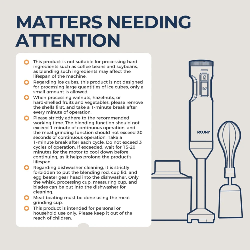 ROUNY electric hand mixer has a powerful 1000W(MAX 1200W) copper motor. The high-precision, German-designed motor has balanced power and long-lasting durability. It makes mixing tasks easier and faster with less noise.
